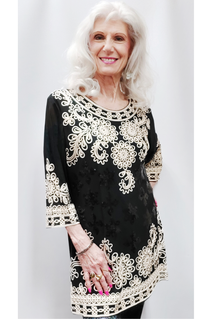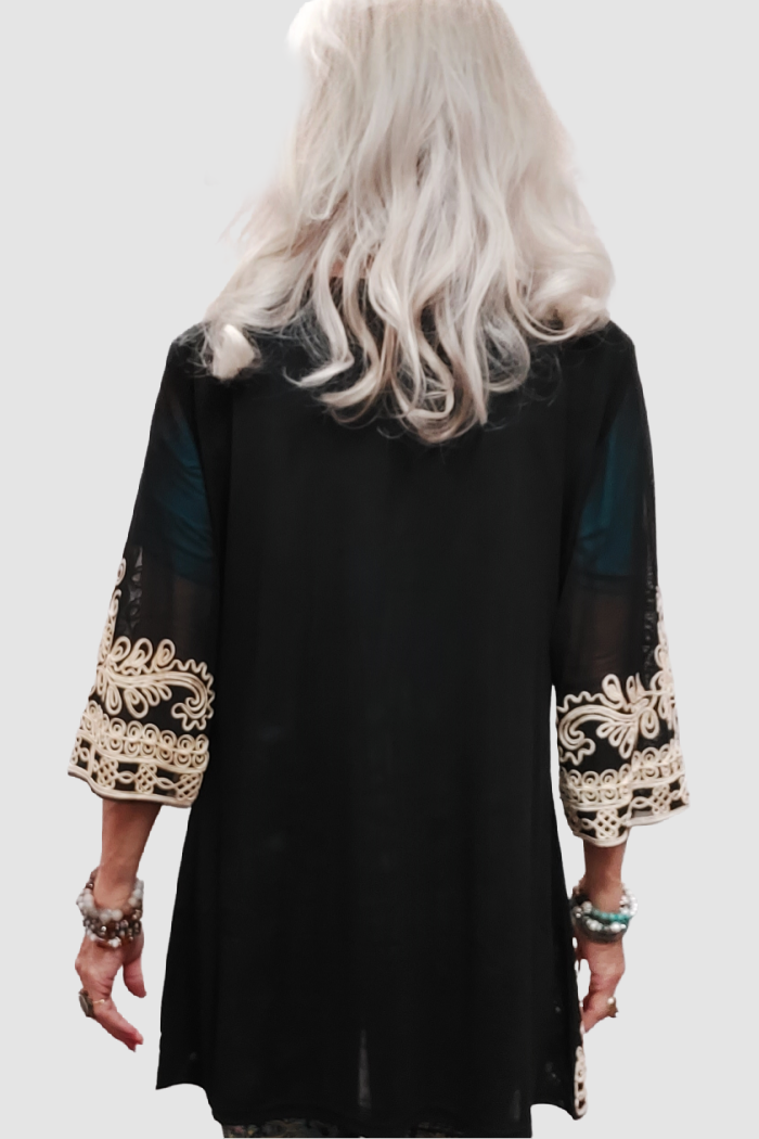 A beauty of a tunic! Two layers of stretchy mesh fabric with gorgeous, intricate ivory detail work and black sequin emblems adorning the front and sleeve edges. Machine washable delicate. Imported.