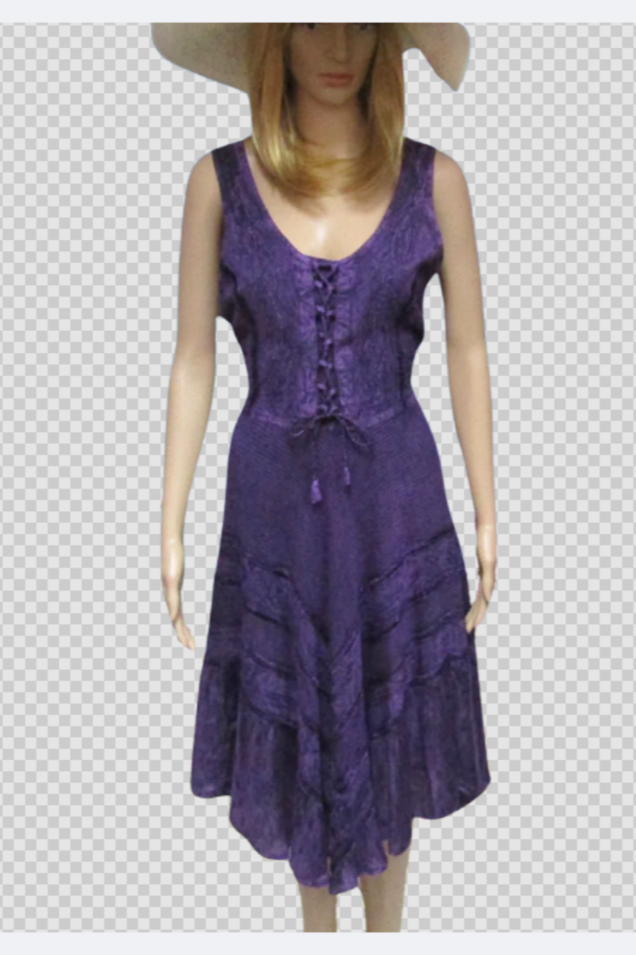 Flattering fit in this front lace-up dress with smocking on back bodice and side ties at waistline. A lot of detail in this beauty of a dress with bodice embroidery and a textured extra full, flouncy, flared skirt featuring embroidered lace inserts. Sandwashed fabric in a dark denim blue. Hand wash and hang to dry. Imported.