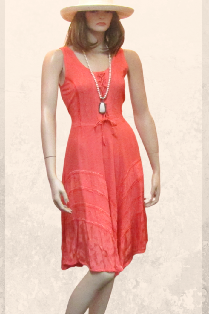 You'll be a standout in this beauty of a dress! An ultra-feminine silhouette features a fitted, lace-up bodice with embroidered detailing and an elasticized back panel with side ties for a comfortable fit. The extra full skirt is gorgeous with a texturey waffle weave fabric, embroidery, lace trims, and a flouncy hemline in a tone-on-tone floral print fabric. A beauty of a dress!