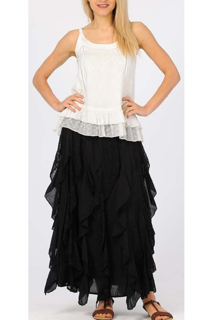 An alluring, oh so feminine skirt. Alternating ruffles of lace and solid fall gracefully to the hemline. This skirt makes an enchanting statement. Foldover waist panel measures 8" wide. Top of waistband to hem measures 38". Can also be worn as a strapless dress. 100% Cotton. Hand wash. Made in India.