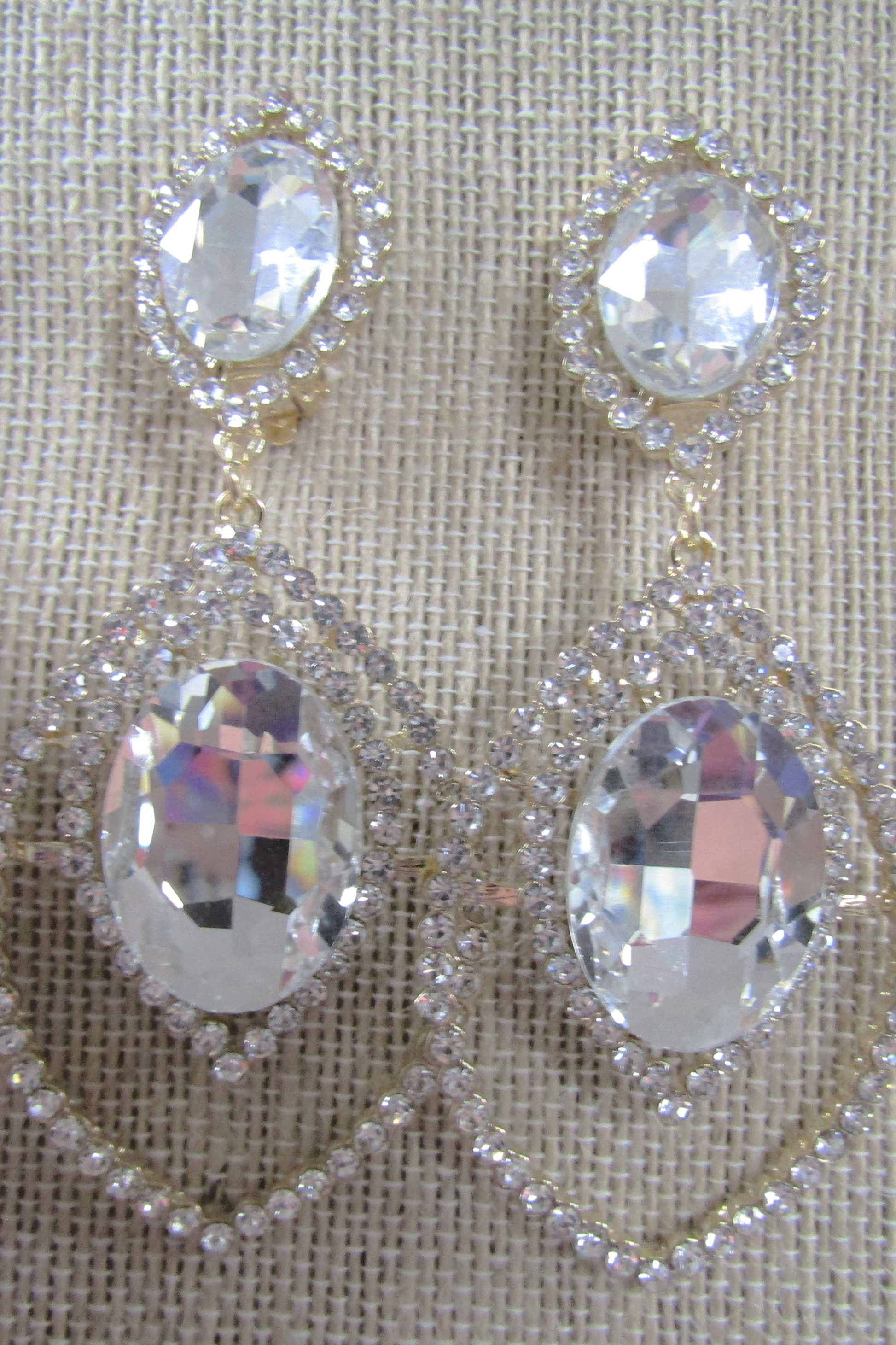 Gorgeous clear faceted rhinestone drop clip earring. It makes a beautiful statement! 3-1/2" drop; 1-1/2" at widest point. Eco friendly alloy; lead and nicket free.