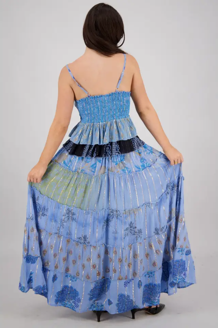 The flowing maxi skirt cascades gracefully in five elegant tiers, fully lined up to the fourth for ease of movement and coverage. With a 39-inch length, it flatters a variety of heights, while the elastic waistband and drawstring offer an effortless, adjustable fit.